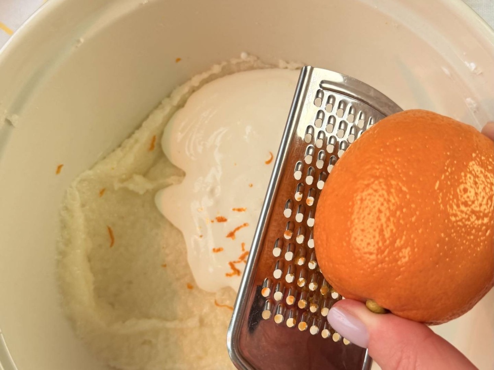К получившейся массе добавляем сметану, цедру лимона и столовую ложку лимонного сока. Если яблоки, используемые для начинки, кислые, лимон можно не добавлять. Иначе пирог будет сильно кислить. Если хотите сделать его сладким, отдайте предпочтение красным яблокам и не используйте лимон.