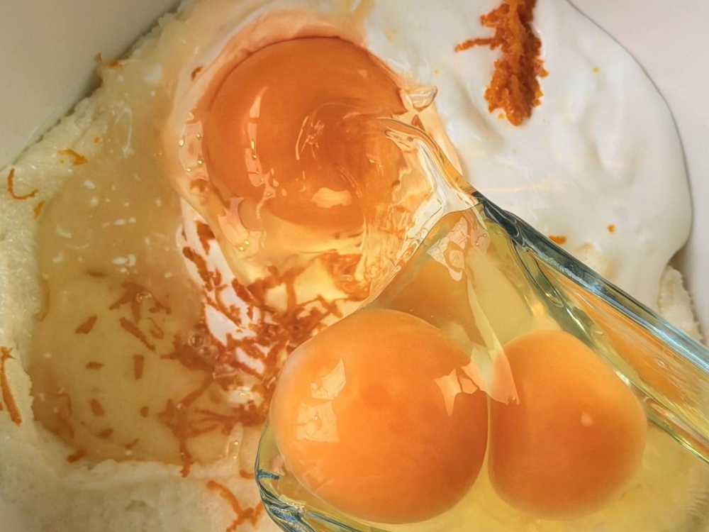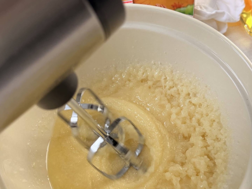 В заготовку разбиваем яйца. Взбивайте тесто подольше. Тогда оно станет пышнее.