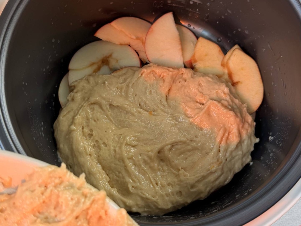 Яблоки заливаем тестом, потом выкладываем второй слой начинки и заливаем оставшимся тестом. Включаем мультиварку на режим “Выпечка” и оставляем на 45 минут. Не открывайте крышку до завершения выпекания и 10-15 минут после. Тогда пирог не осядет и останется пышным.