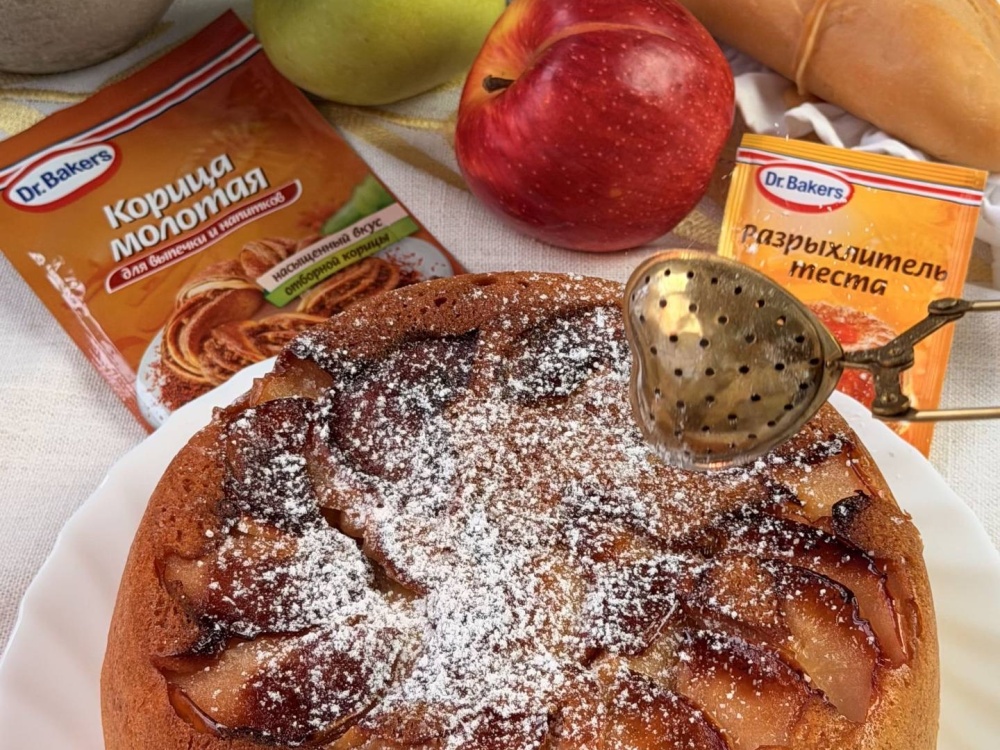 Дайте пирогу остыть и украсьте сахарной пудрой, корицей, мятой, свежими яблоками.