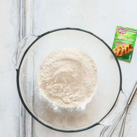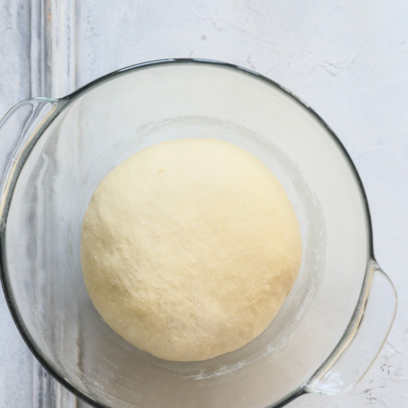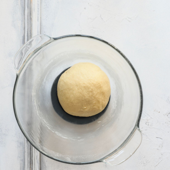 Придаем массе форму шара, кладем в кастрюлю, накрываем крышкой или пленкой, оставляем на 60 минут. Для ускорения процесса поднятия опары можно поместить ее в духовку с режимом на 40 градусов.