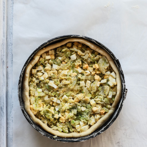 Наполняем наш пирог капустной начинкой, для этого равномерно распределяя ее по всей площади пирога.