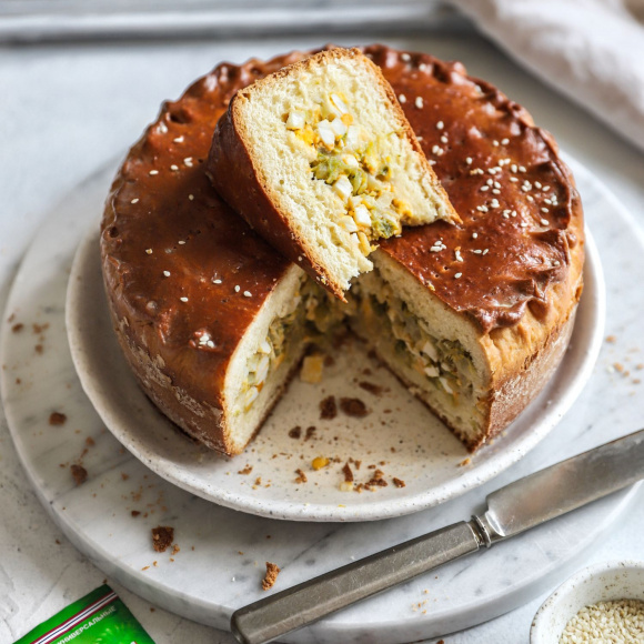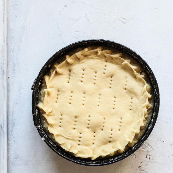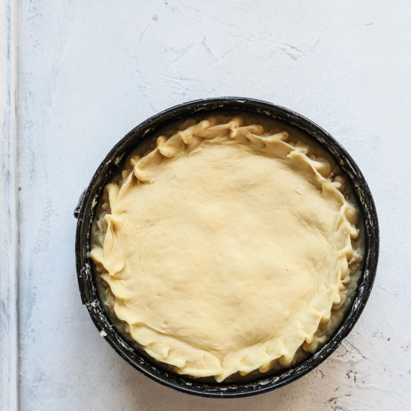 Вторую часть теста тоже раскатываем. Должно получиться немного тоньше, чем основание пирога, но по размерам такое же. Накрываем начинку, аккуратно соединяем края между собой.
