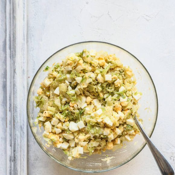 Высыпаем нарезанные яйца в капусту и перемешиваем до однородной массы.