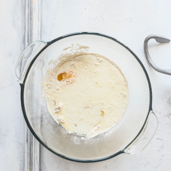 Взбиваем куриное яйцо с сахаром и солью, затем добавляем молоко, высыпаем муку. Для замешивания опары можно использовать миксер или блендер, либо обойтись без помощи технических средств и сделать все руками.
