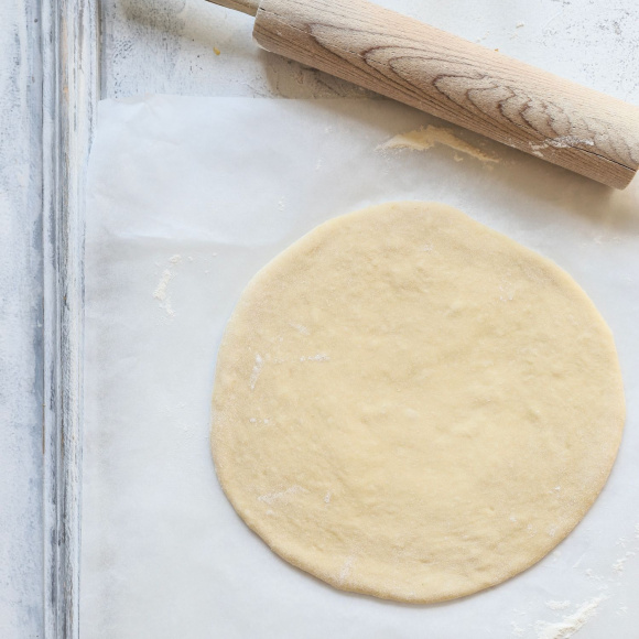 Ту часть теста, которая больше раскатываем, придаем форму противня/формы для выпечки. Перед тем, как выкладывать пласт на противень не забудьте смазать его маслом. Чтобы начинка не вытекла аккуратными движениями формируем бортики из теста по всему периметру противня.