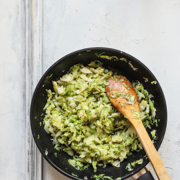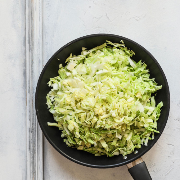 Средний качан капусты нарезаем мелкой соломкой. Затем выкладываем ее на разогретую сковородку, смазанную небольшим количеством масла. Накрываем крышкой, тушим периодически помешивая. Когда капуста отдала весь сок и стала мягкой добавляем соль, перец по вкусу, выключаем плиту.