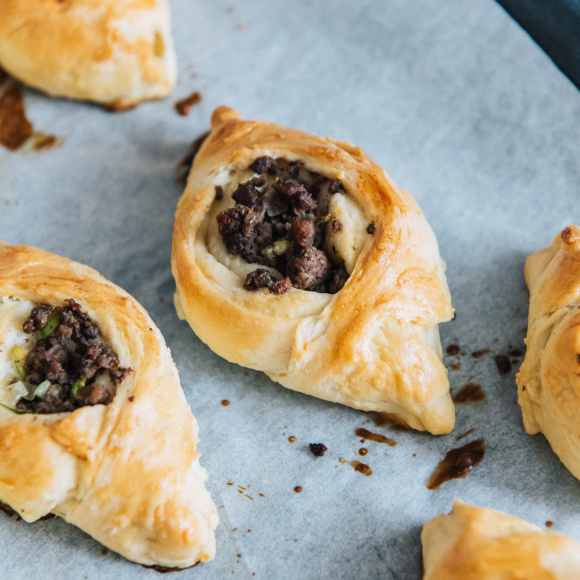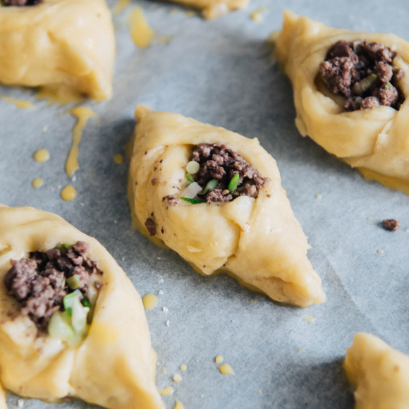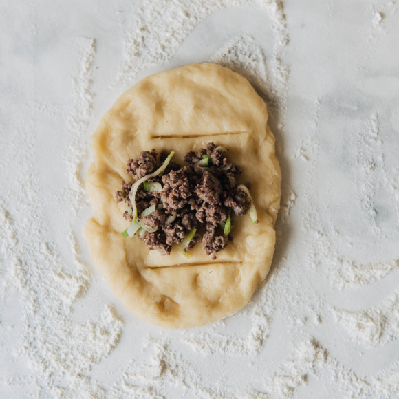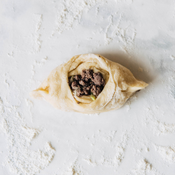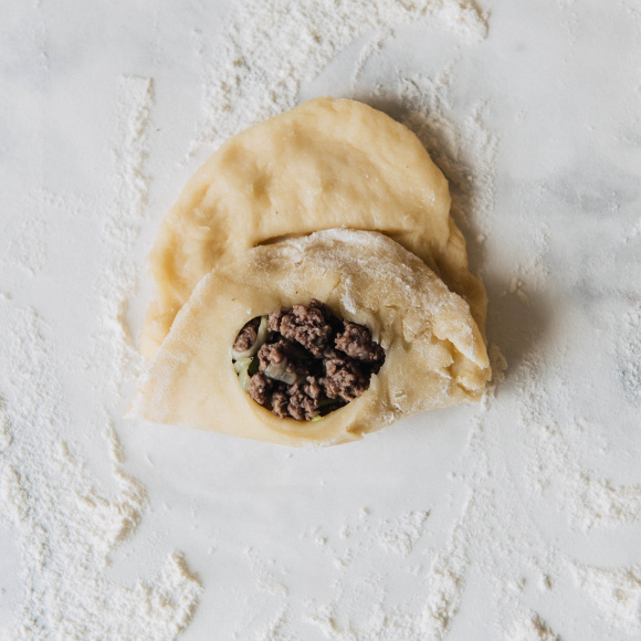 Дальше накрываем фарш одной стороной теста с надрезом, так чтобы надрез оказался поверх фарша. Затем то же самое делаем со вторым краем. Надрез в данном случае служит отверстием для начинки.