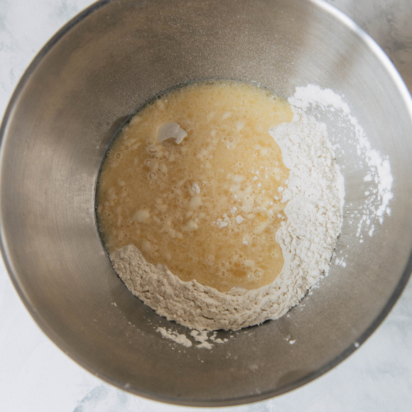 Рекомендуем для замеса муки использовать миксер. Берём нашу мучную смесь в количестве ⅓ от общей массы, засыпаем в чашку миксера, делаем несколько углублений и заливаем их яично-молочной смесью.