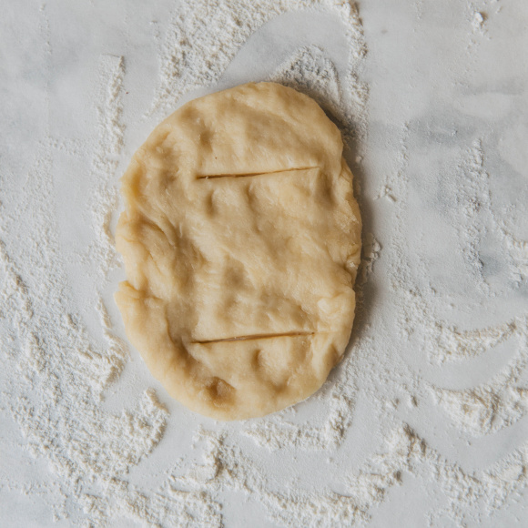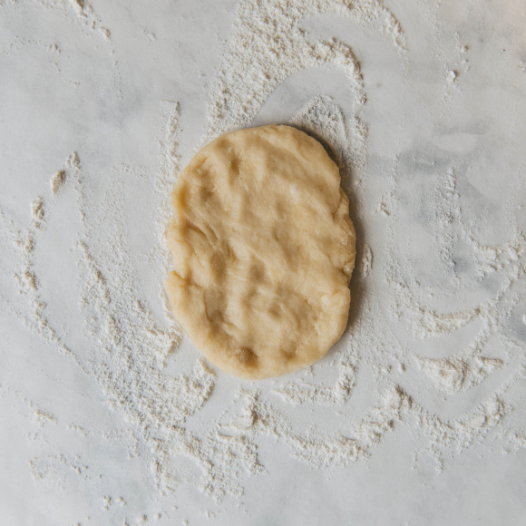 Отрываем небольшой кусочек теста и раскатываем его по столу. Должен получится овал диаметром около 15 см(плюс-минус). Внутри делаем тесто чуть толще, чем по краям.