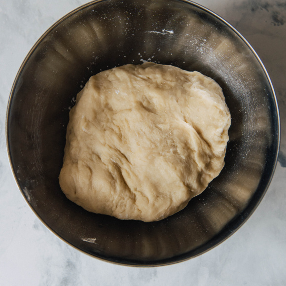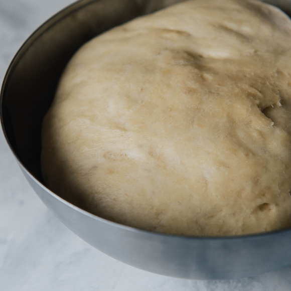 Готовое тесто складываем в глубокую миску, накрываем полотенцем и даём постоять в тёплом месте около часа.