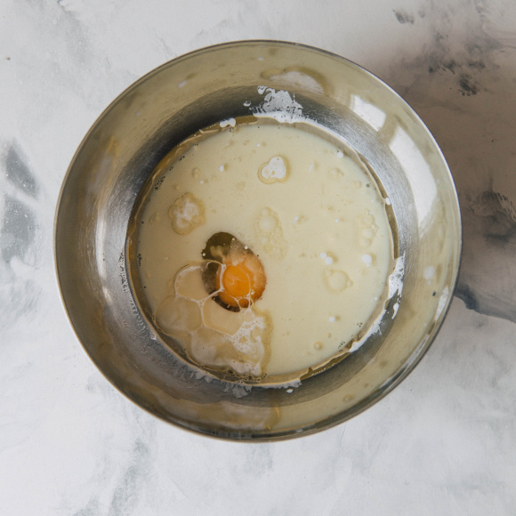 Подготовим будущее тесто для пирожков. Для этого возьмем глубокую миску, вольем туда молоко, добавим сахар, соль растительное масло и яйцо. Затем тщательно перемешиваем данную смесь при помощи миксера или венчиком, как вам будет удобнее.