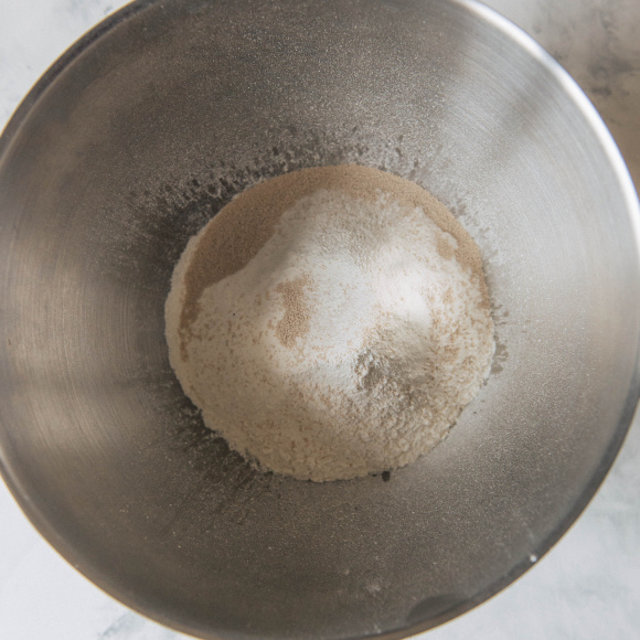 В отдельной ёмкости смешиваем 300 г муки с дрожжами.
