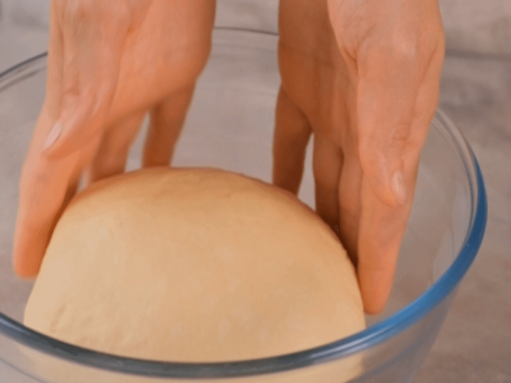Формируем из теста шар, перекладываем его в чистую миску, смазанную маслом, накрываем плёнкой или полотенцем и оставляем в тёплом месте расстаиваться 40-60 минут.