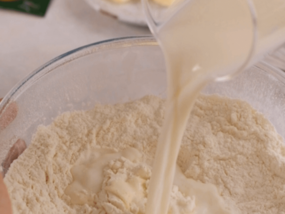 Делаем в центре углубление, вливаем тёплое молоко (250 мл), добавляем яйцо (1 шт.) комнатной температуры. Начинаем замешивать тесто с помощью венчика или вилки, смешивая жидкие ингредиенты в центре и понемногу прихватывая муку с краёв.