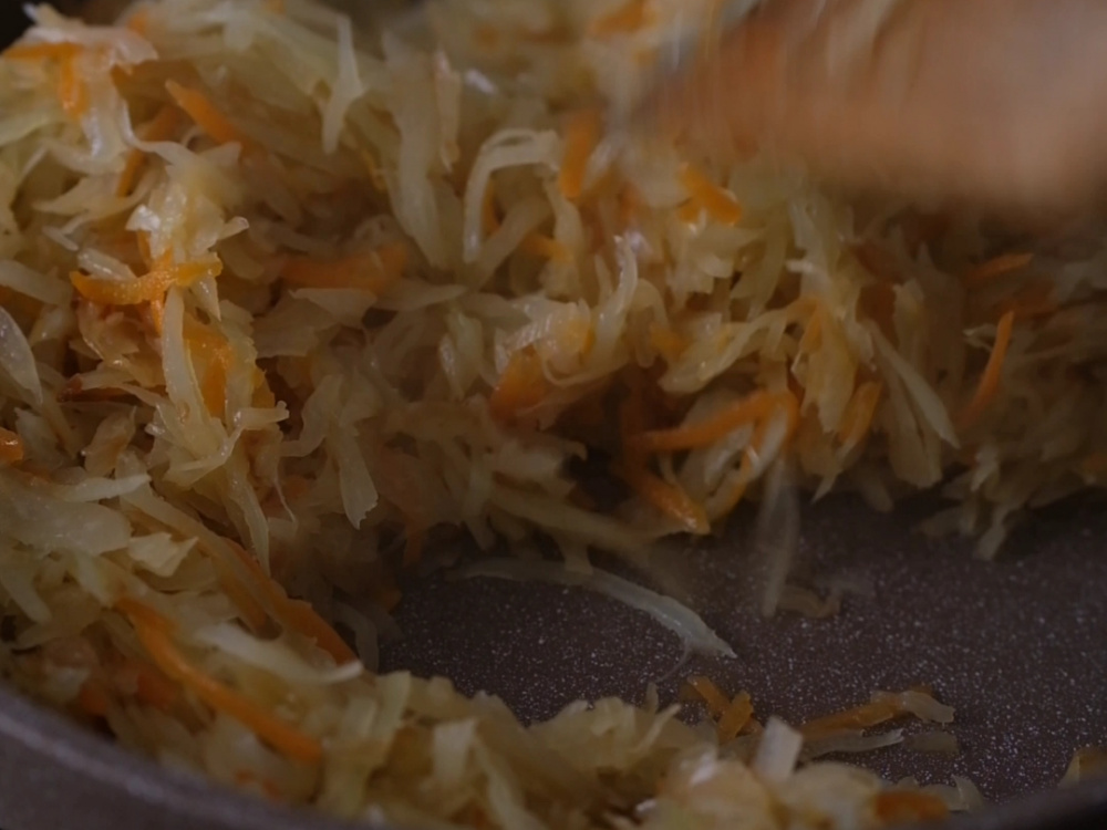 Для капустной начинки мелко шинкуем капусту. Солим и слегка обминаем её руками. Растапливаем на сковороде сливочное масло и выкладываем капусту. Даём ей прижариться до золотистой корочки и только потом переворачиваем. Благодаря этому начинка обретет золотистый цвет и нужный аромат. Добавляем немного тёртой морковки и обжариваем капусту до готовности. Если капуста грубоватая, можно накрыть её крышкой и немного потушить.