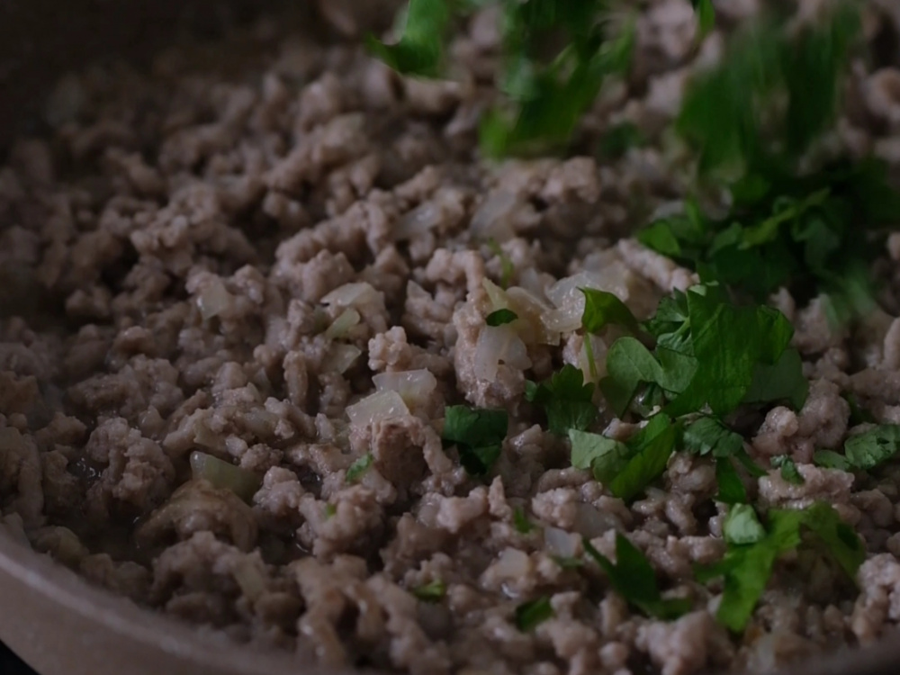 За это время приготовим два вида начинки. Для мясной начинки мелко режем лук. Слегка обжариваем его на сковороде до полупрозрачного состояния. Выкладываем фарш, солим и перчим. Готовим фарш на среднем огне, периодически помешивая до готовности. Добавляем свежую зелень и перемешиваем.