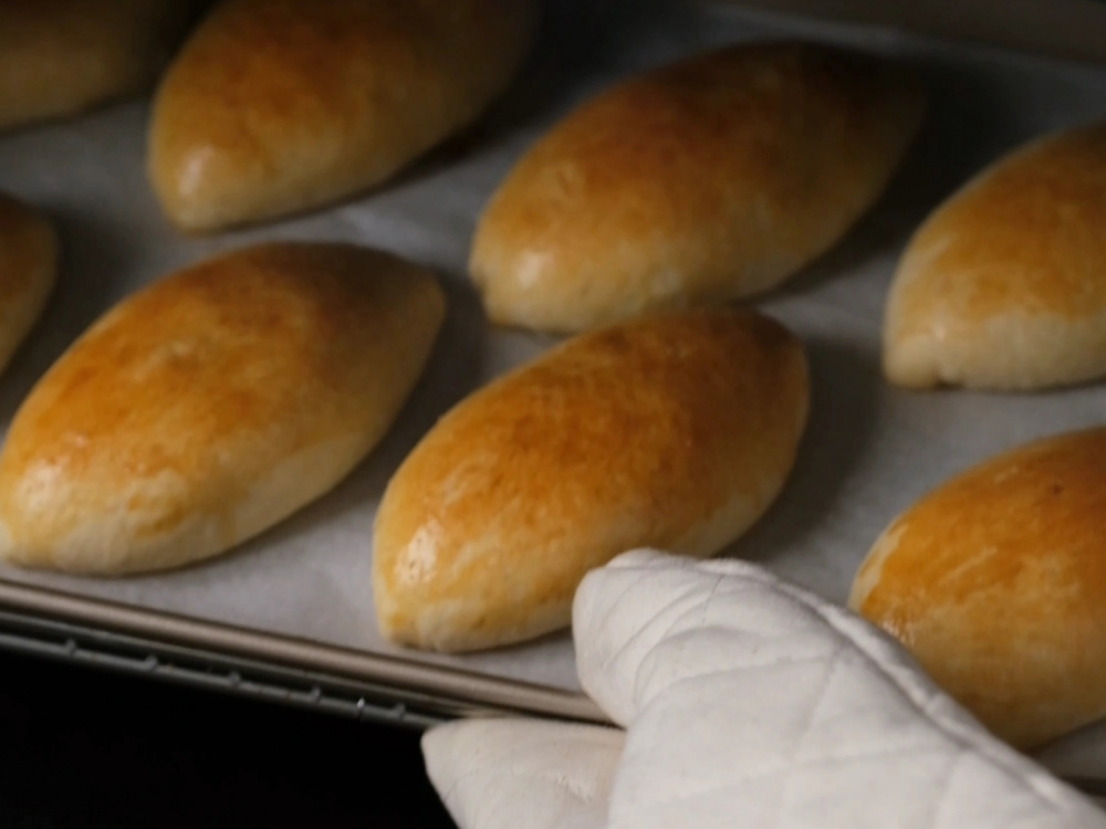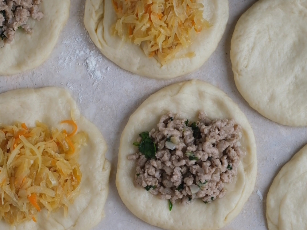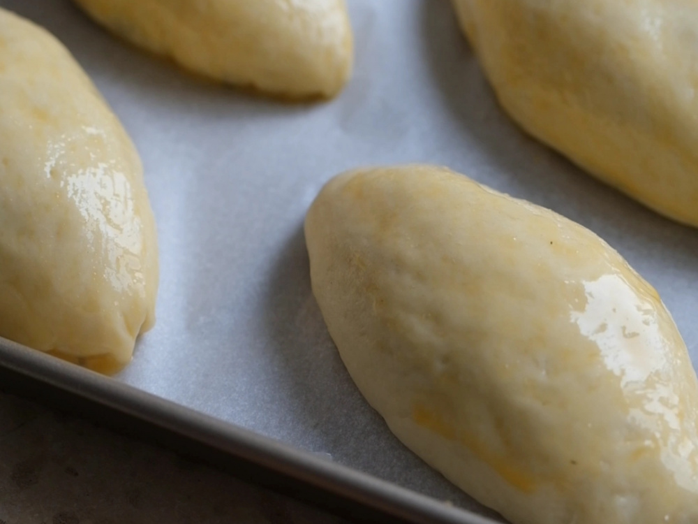 Выкладываем пирожки на противень, накрываем полотенцем на 15 минут. Смазываем поверхность пирожков желтком и отправляем в разогретую до 180–190°C духовку на 20–25 минут.