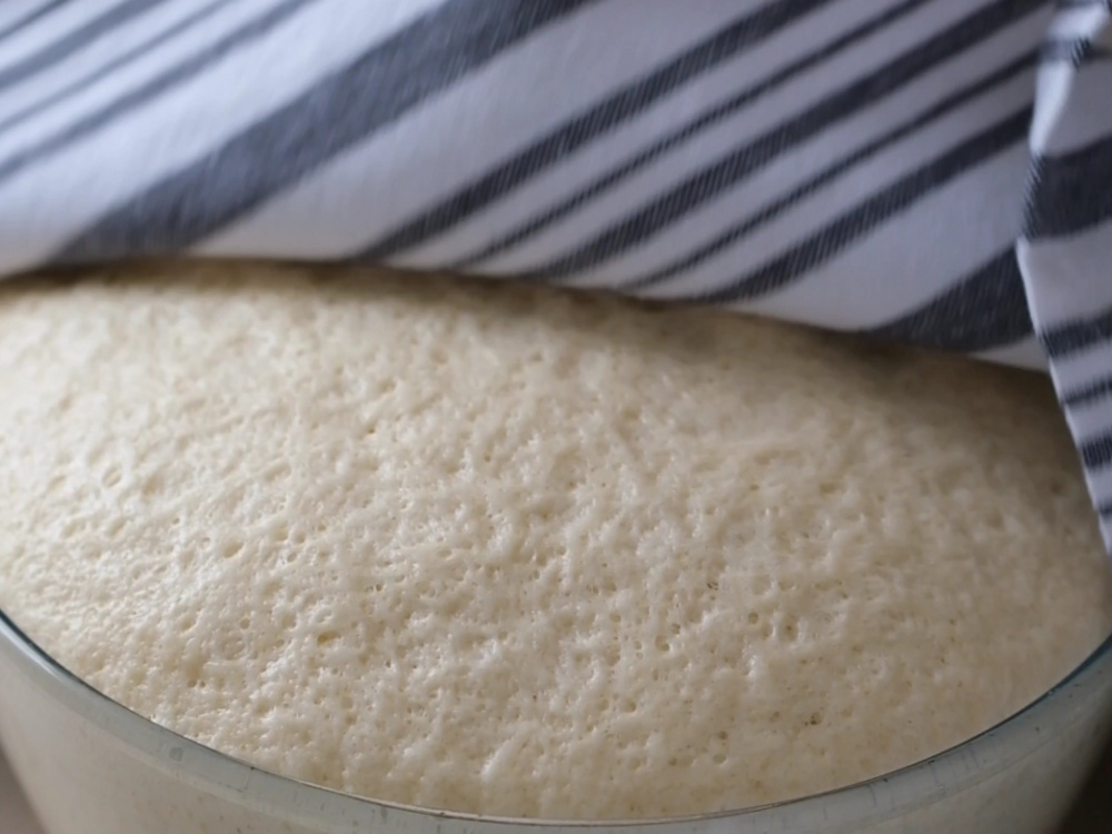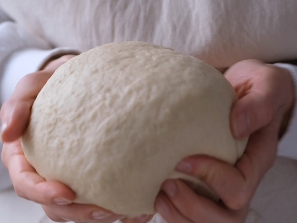 Формируем из теста шар, укладываем в чистую миску, накрываем полотенцем и отправляем на расстойку в тёплое место на 1 час. За это время тесто должно увеличиться в объеме в 2–3 раза.