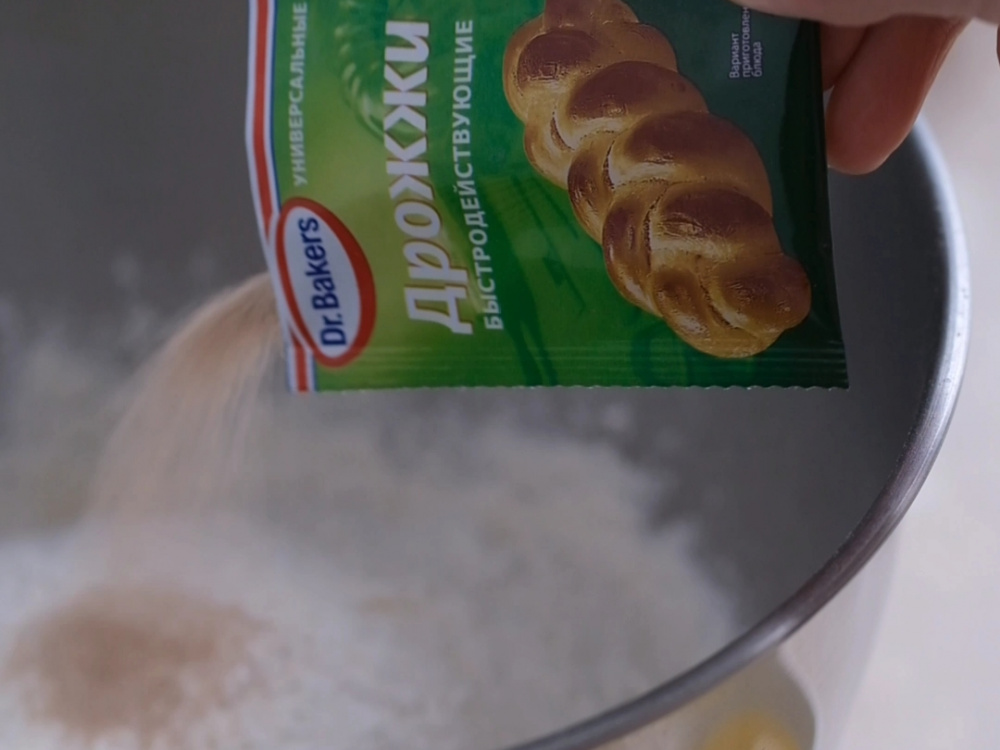 В большую миску просеиваем муку. Добавляем дрожжи, сахар и соль, перемешиваем.