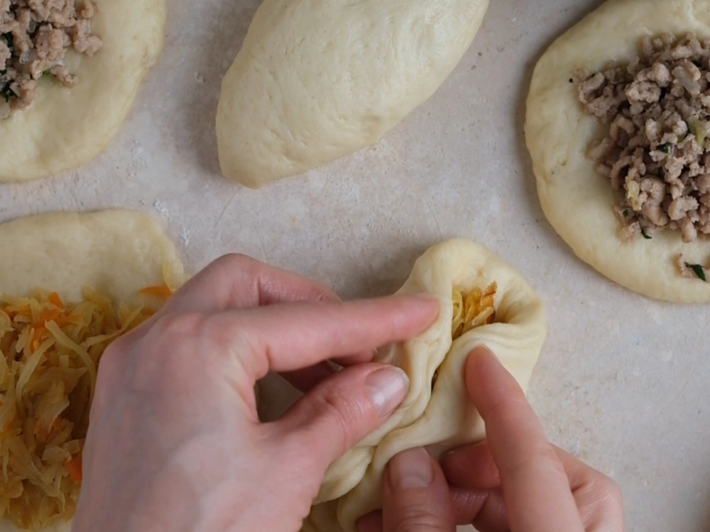 Соединяем края, формируя пирожок, и переворачиваем швом вниз.