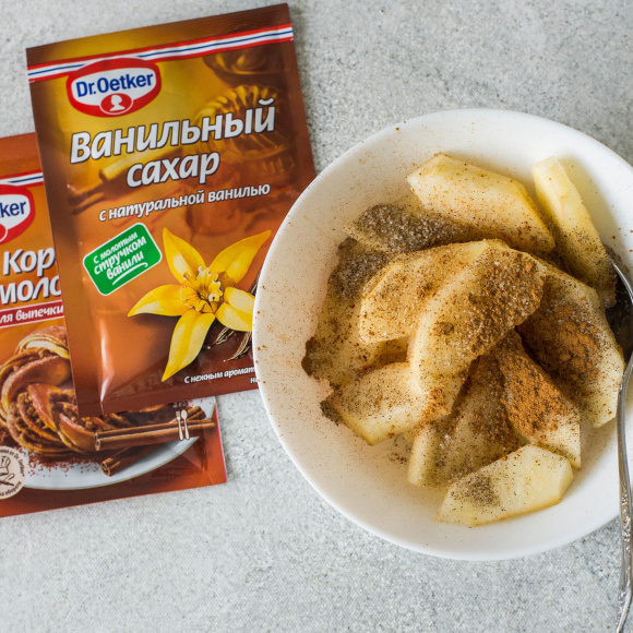 Посыпаем плоды ванильным сахаром, а также корицей молотой Dr. Oetker, поливаем медом.