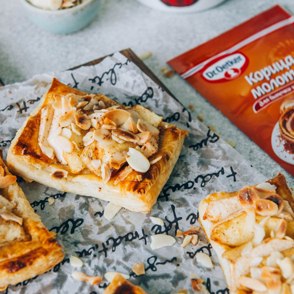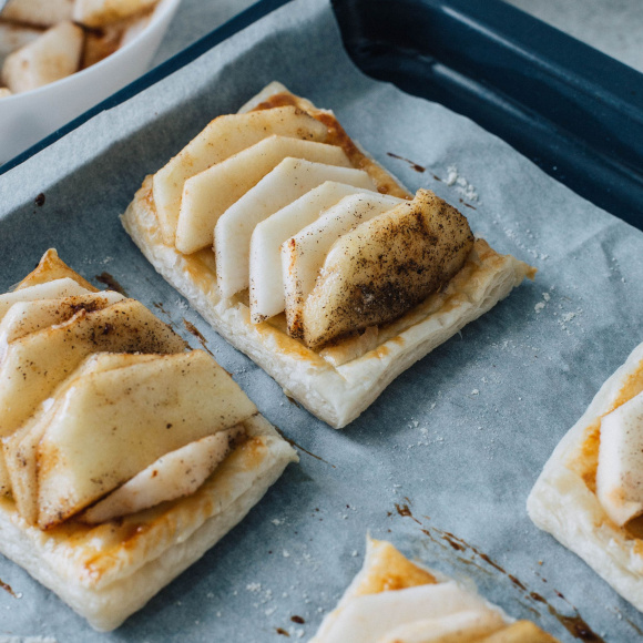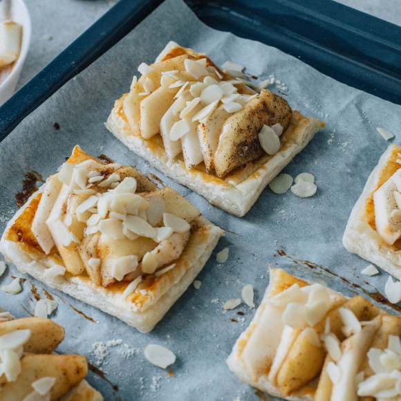 Отправьте слойки с яблоками еще на 10 минут в духовой шкаф при температуре 200°.