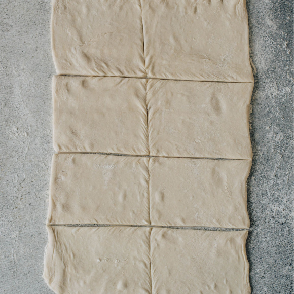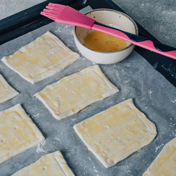 Дрожжевое слоеное тесто разморозьте, раскатайте в пласт высотой в полсантиметра, затем разрежьте на 8-10 прямоугольников.
