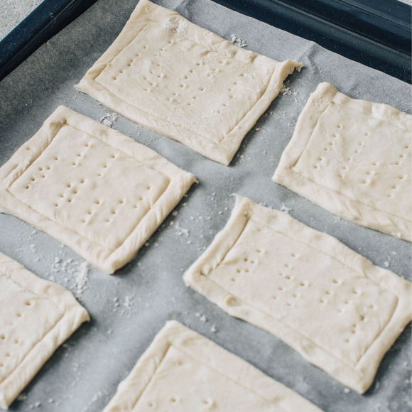 Выложите подготовленную основу для будущих слоек с яблоками на противень, застеленный пергаментом.
