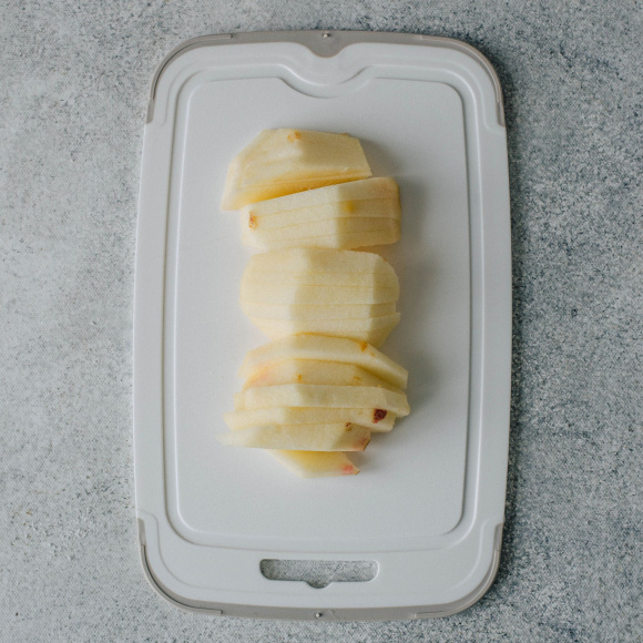 Очищенные от кожуры и сердцевины фрукты нарежьте на продолговатые кусочки толщиной до 5 мм.