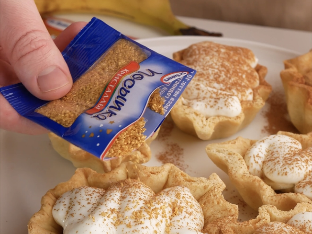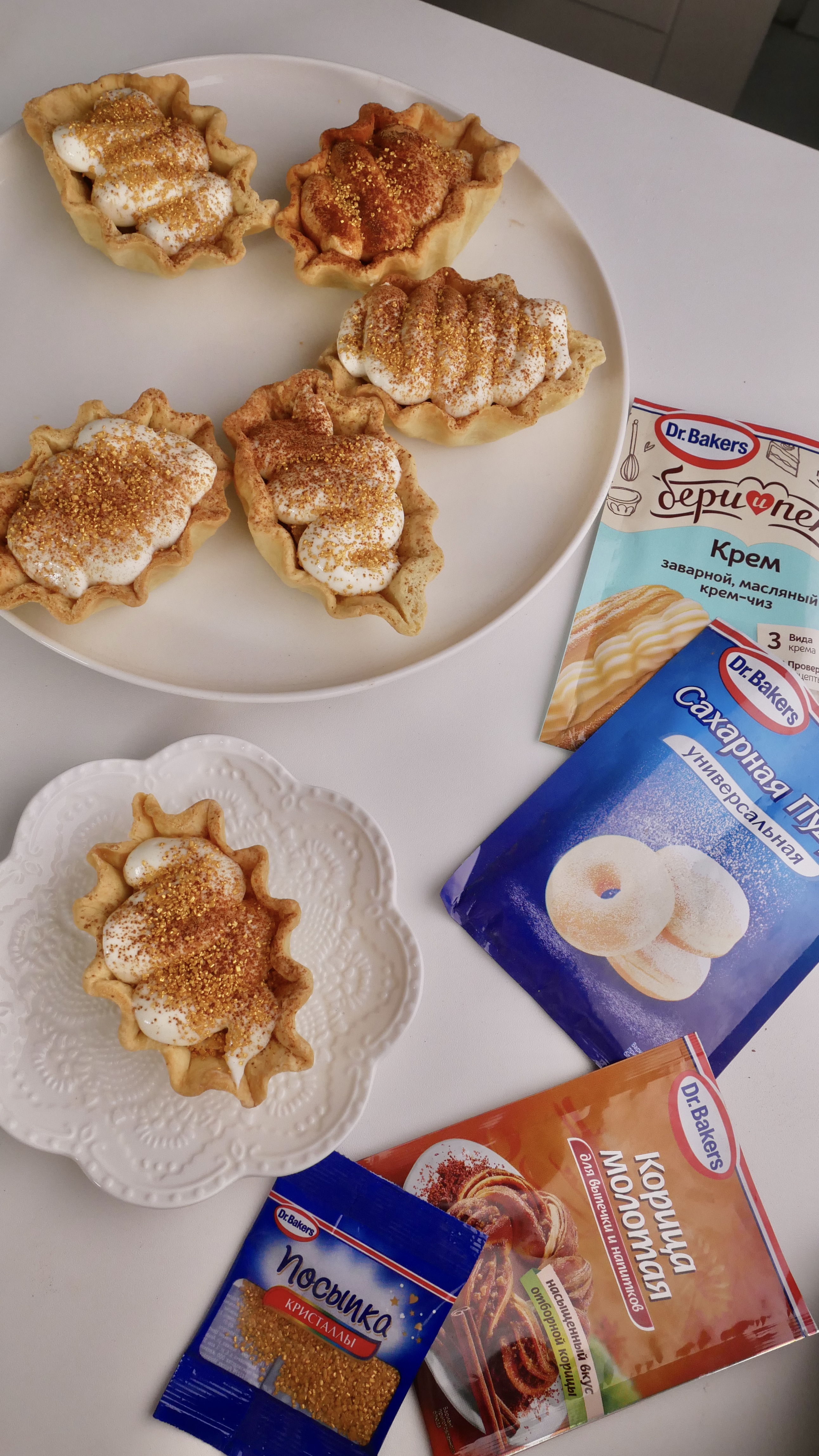 Добавляем сверху готовый крем. Посыпаем корицей Dr. Bakers (1 ч. л.) и посыпкой «Кристаллы» Dr. Bakers (1 уп.).