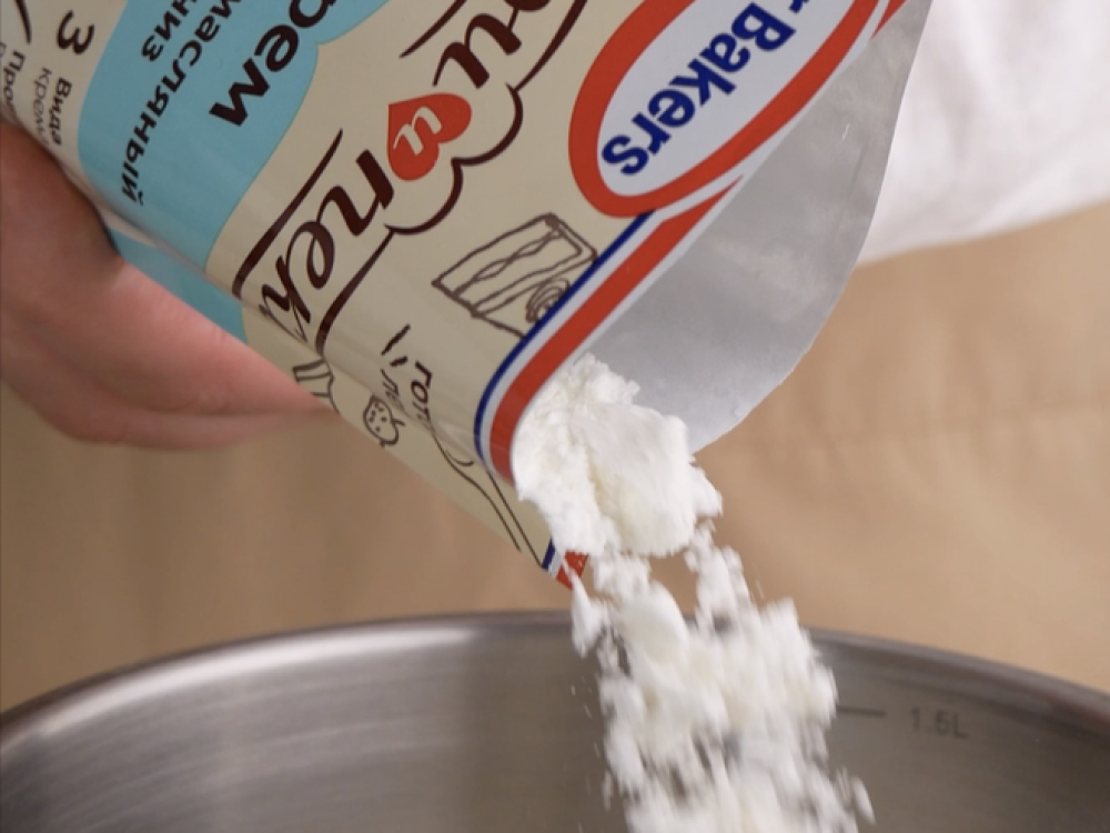 Готовим крем. Холодное молоко (300 мл) смешиваем со смесью «Бери и пеки: для заварного крема» (1 уп.). Помешивая, увариваем до загущения и остужаем под плёнкой. Творожный сыр (600 г) взбиваем с сахарной пудрой Dr. Bakers (60 г). Частями вводим остывший заварной крем, продолжая взбивать на средней скорости.