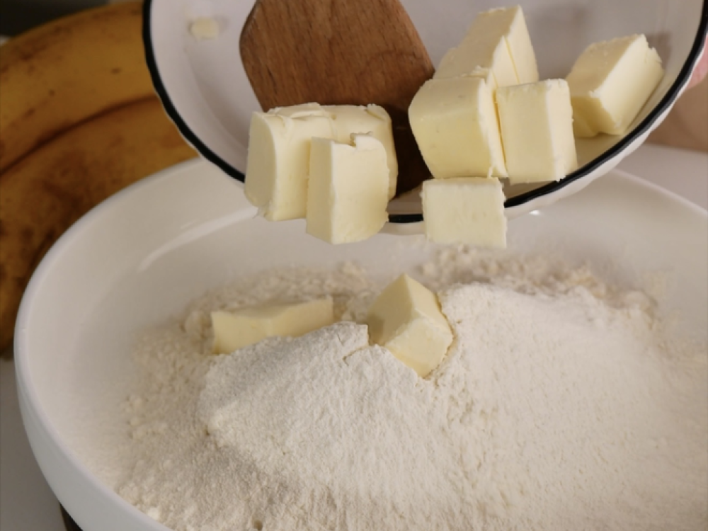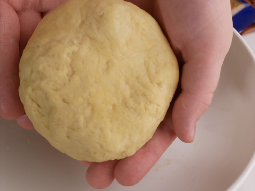 Готовим тесто. Смешиваем муку (180 г) с солью (1/2 ч. л.) и охлаждённым сливочным маслом (80 г). Добавляем яйцо (1 шт.), молоко (1 ст. л.), замешиваем тесто и охлаждаем в пакете 30 минут в холодильнике.