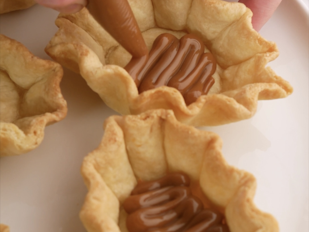 Остывшие песочные основы заполняем вареной сгущёнкой (150 г), укладываем сверху несколько кружков свежего банана (100 г).
