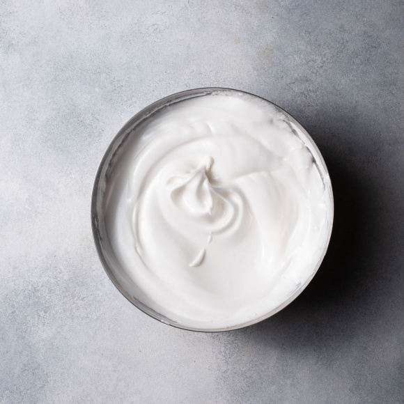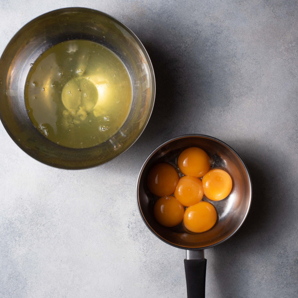 Достаём яйца из холодильника и отделяем белки от желтков. К белкам добавляем также еще один белок. Накрываем пищевой плёнкой и оставляем при комнатной температуре на полчаса. ②