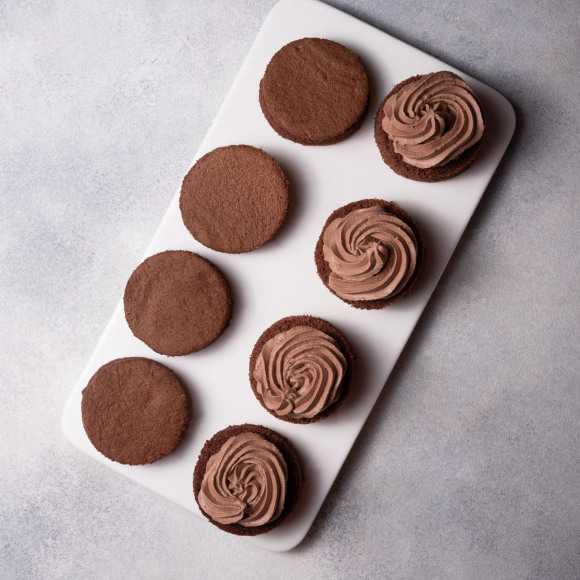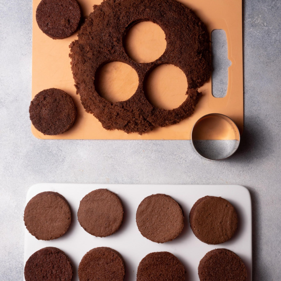Разрезаем полностью остывший бисквит на 2-3 круга и из каждого вырезаем несколько небольших кружков с помощью металлической формы.