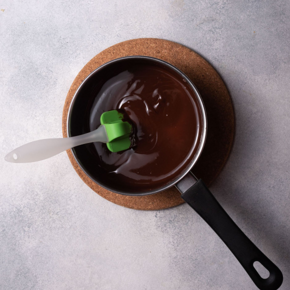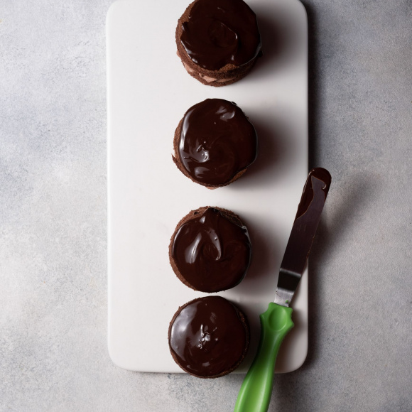 Сверху кладём круг бисквита и наносим остывшую глазурь.