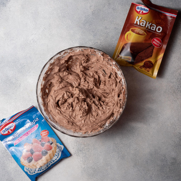 Добавляем какао Dr. Bakers, сахарную пудру Dr. Bakers, гранулы кофе (по желанию) и ещё раз взбиваем.