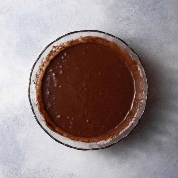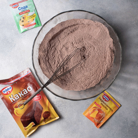 В миске хорошо перемешиваем сухие ингредиенты для бисквита: муку, какао Dr. Bakers, 150 г сахара, соду Dr. Bakers, разрыхлитель Dr. Bakers и соль.