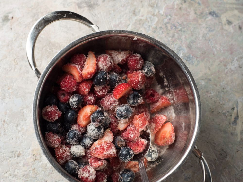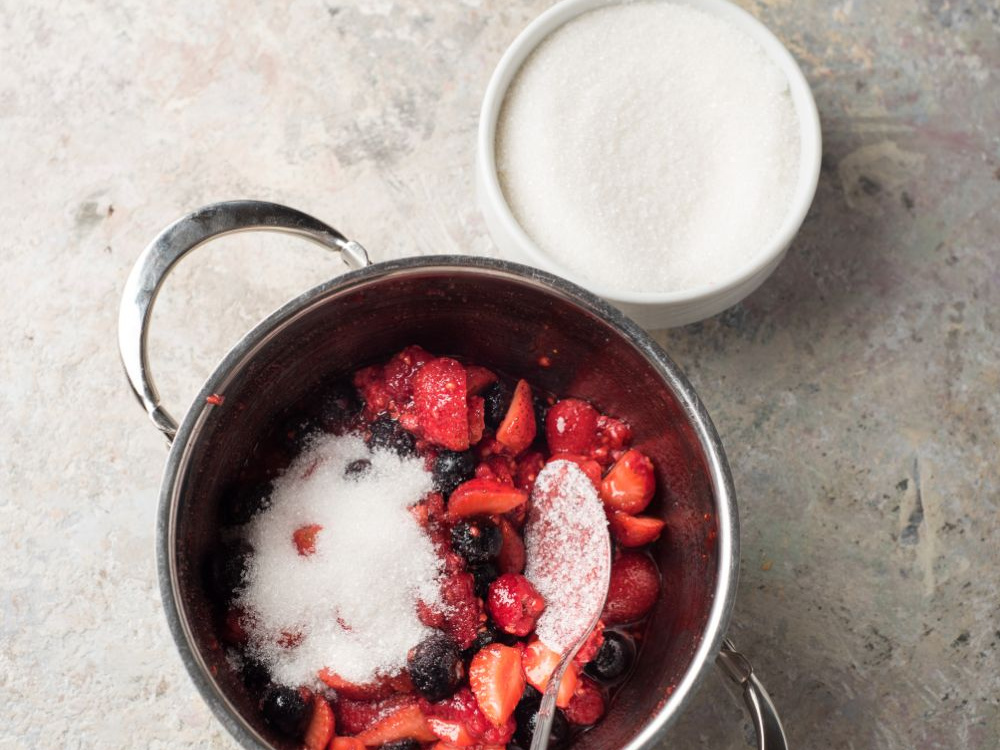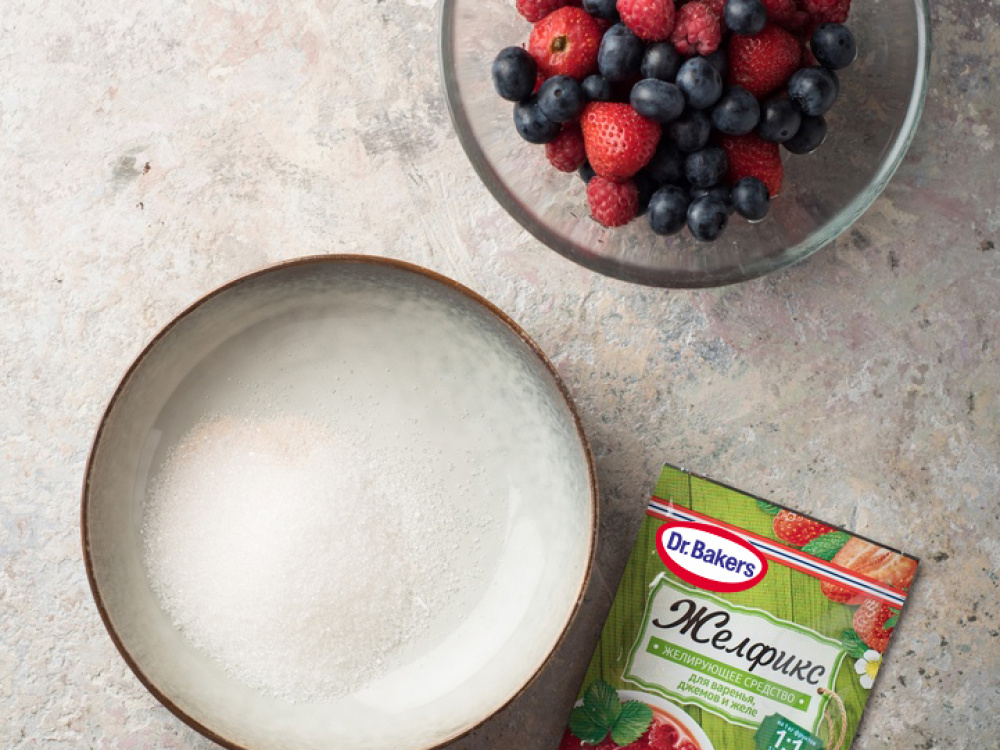 Желфикс смешиваем с двумя столовыми ложками сахара, добавляем к ягодам и перемешиваем.