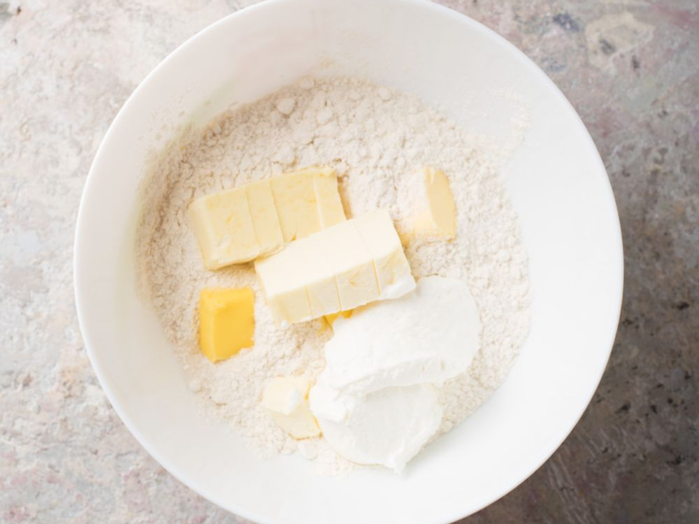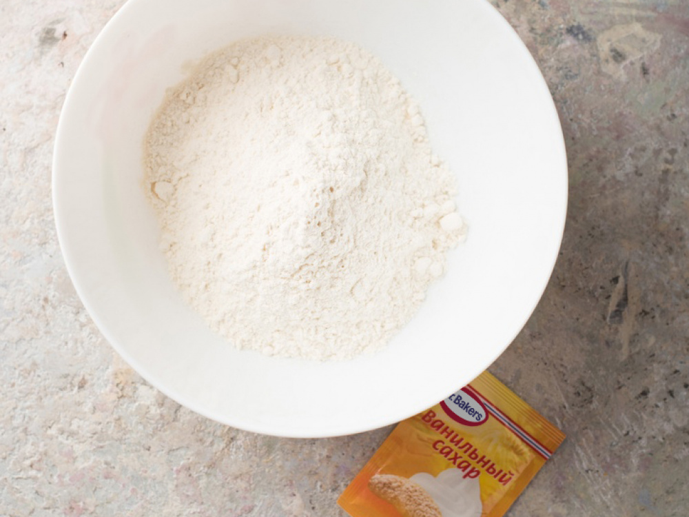 Добавляем кубики холодного масла и творог, пальцами перетираем тесто до образования единой массы, убираем тесто в холод.