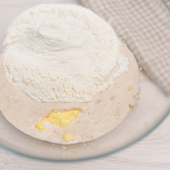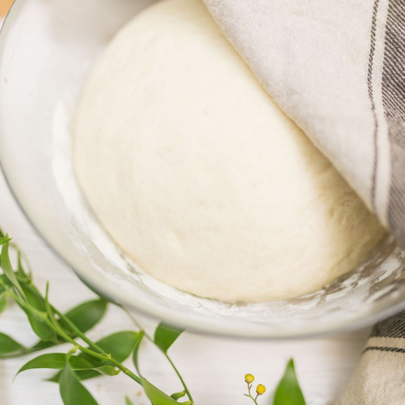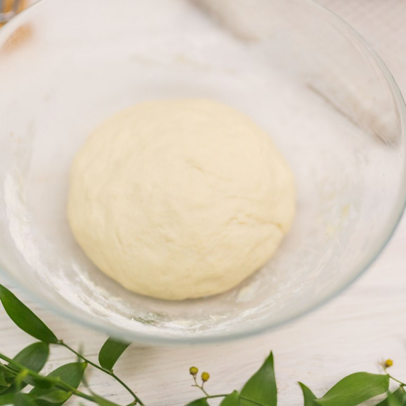 Переложите тесто в глубокую емкость, позволяющую массе свободно увеличиваться в 2‒3 раза. Стенки емкости заранее припудрите мукой, чтобы тесто не прилипало. Накройте сверху полотенцем и поставьте на один час в теплое место для подъема.