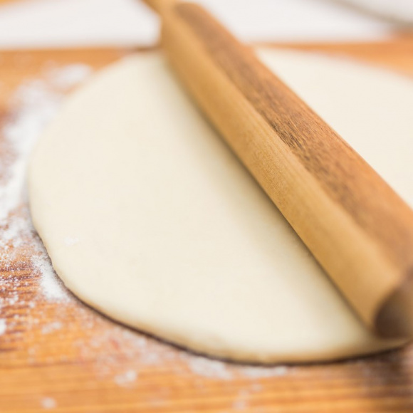 На столе, слегка присыпанном мукой, или сразу на противне, смазанном оливковым маслом, раскатайте скалкой из теста тонкий пласт в размер формы. Заранее включите для прогрева духовку.