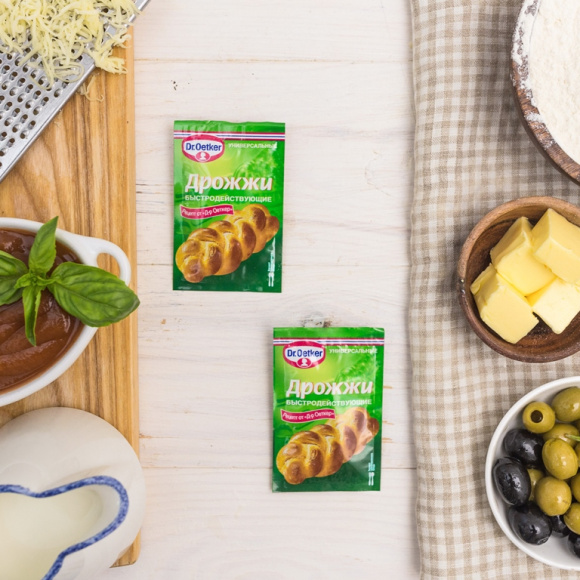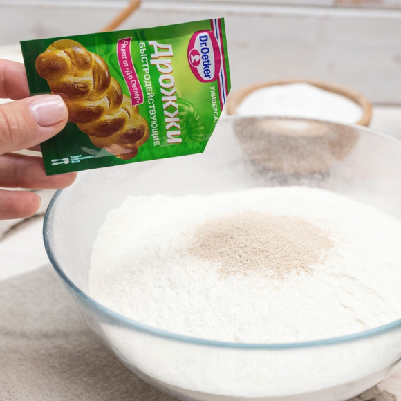 В глубокую миску насыпьте муку, равномерно смешайте с дрожжами. Влейте 1,5 ст. л оливкового масла в мучную смесь, соедините с растворенными в молоке остальными ингредиентами.