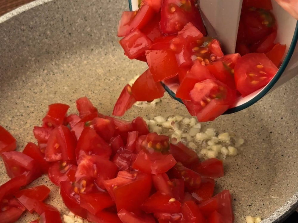 Для соуса необходимо измельчить и подготовить помидоры. В разогретом оливковом масле на сковороде обжаривают измельченный чеснок и добавляют туда томаты и красное вино. Все ингредиенты тушат 4 минуты. После добавив соль, перец, базилик и орегано, перемешивают и готовят еще 3 минуты.