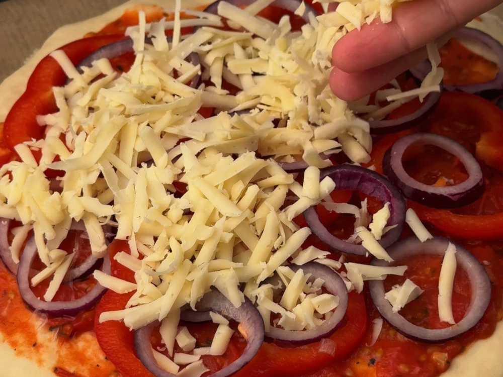 Равномерно по поверхности распределяем подготовленный соус. Поверх соуса выкладываем овощи. Блюдо посыпаем сыром и отправляем в духовой шкаф.