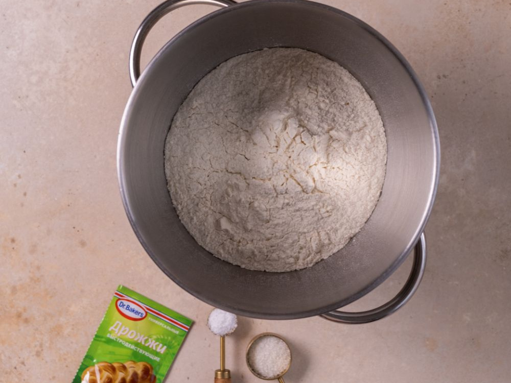 Муку (500 г) смешиваем с дрожжами (7 г), сахаром (1 ст. л.) и солью (1 ч. л.).