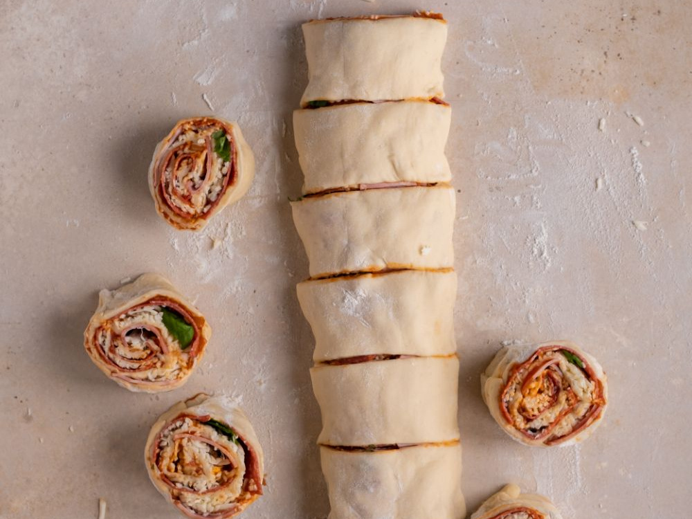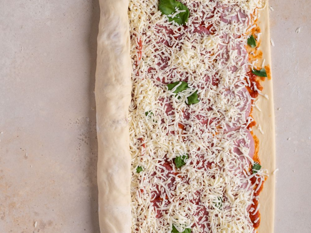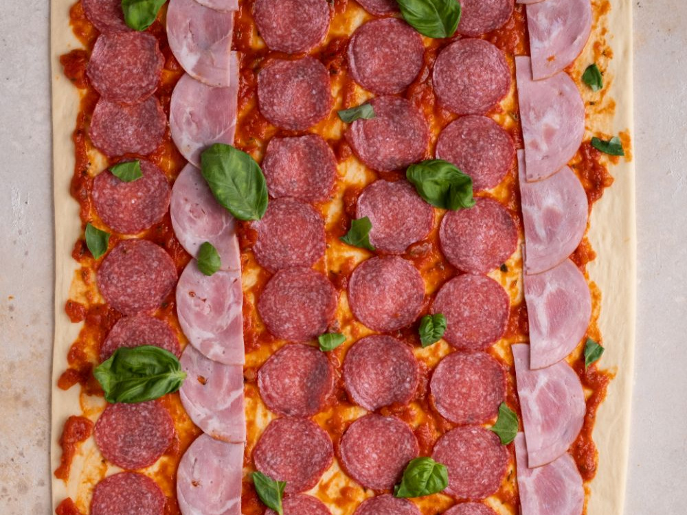Обминаем тесто и раскатываем в прямоугольный пласт толщиной 5-7 мм. Наносим томатный соус (300 г) ровным слоем. Выкладываем ветчину (120 г) и салями (120 г). Посыпаем тёртым сыром (200 г).