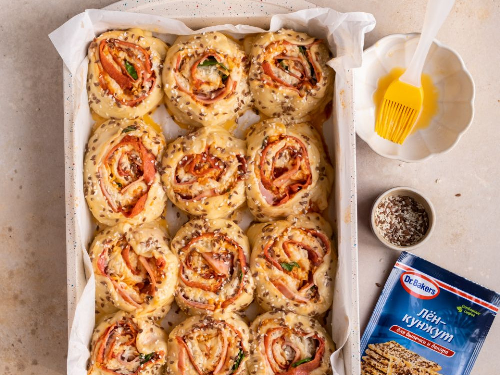 Перед выпечкой смазываем поверхность смесью желтка (1 шт.) и молока (1 ст. л.) и посыпаем смесью «Лён-кунжут». Отправляем в разогретую до 180°С духовку на 30-35 минут, выпекаем до золотистой корочки.