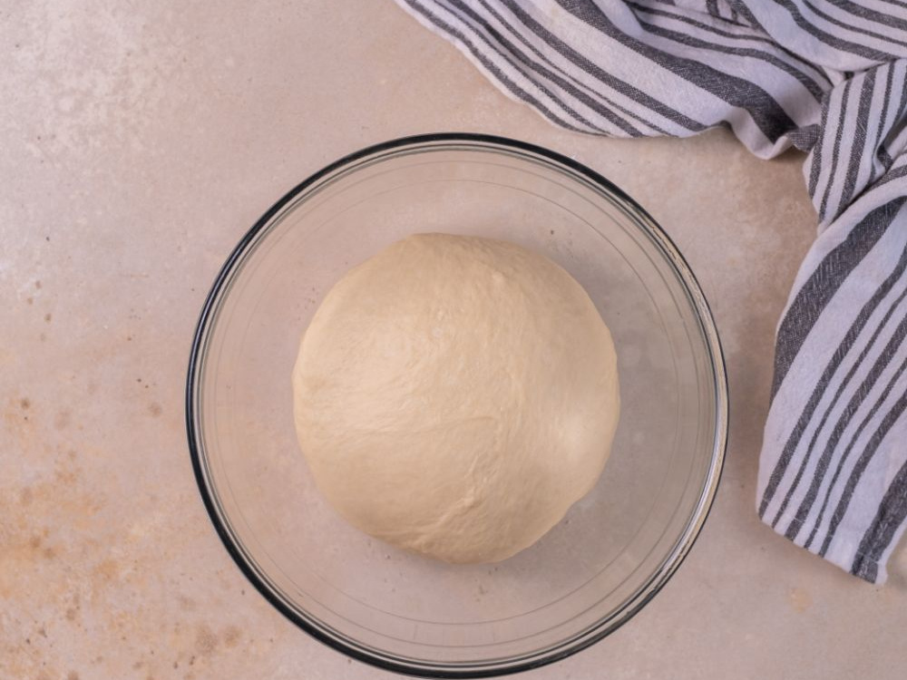 Замешиваем тесто в течение 10 минут до гладкого эластичного состояния. Перекладываем тесто в чистую миску, смазанную маслом, накрываем плёнкой или полотенцем и отправляем на расстойку в тёплое место на 1 час. За это время тесто должно увеличиться в два раза.